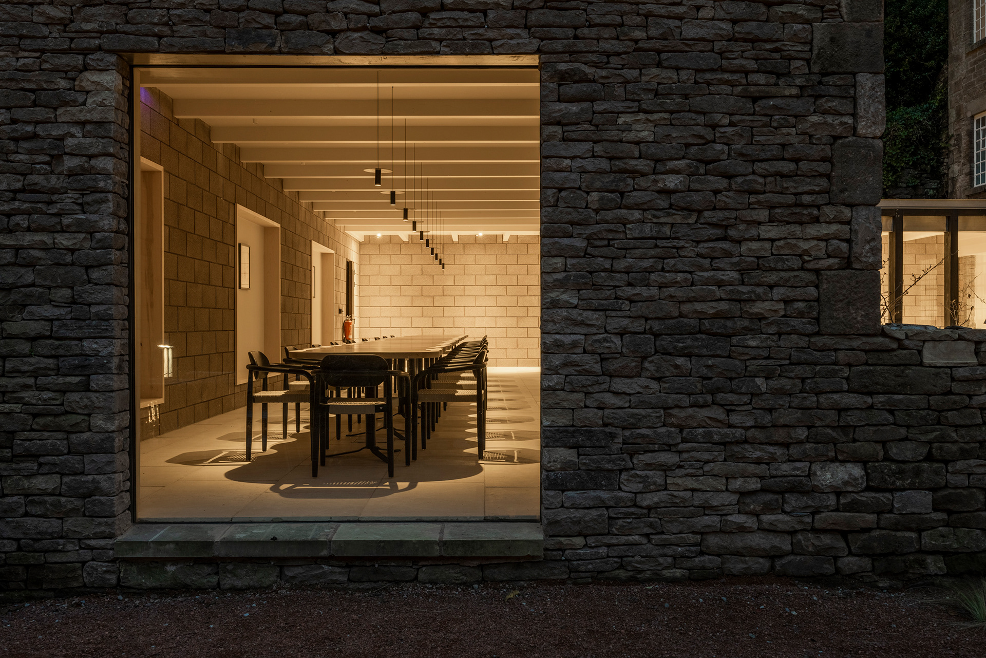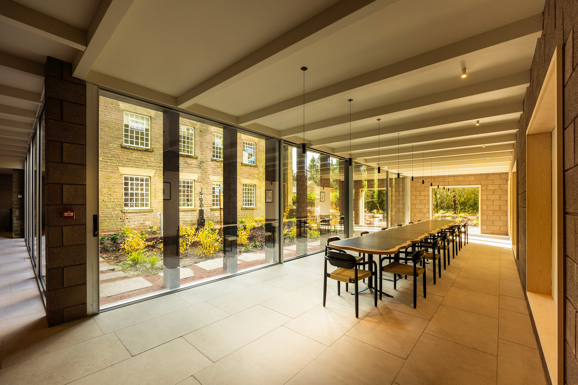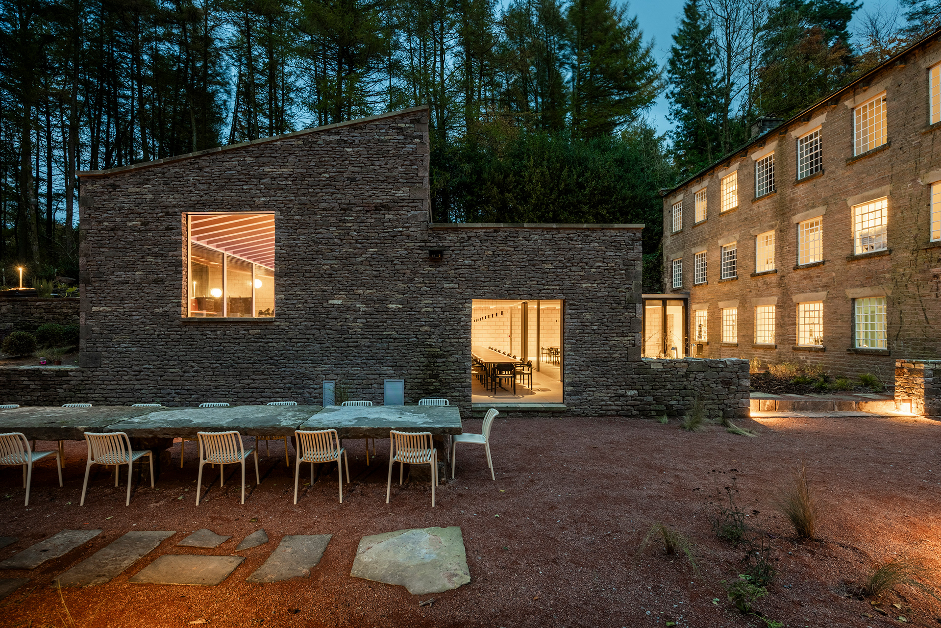 Filmmaking and photography of the meticulously restored former printworks in the heart of the Peak District with a striking contemporary extension. ARC Peaks is designed to host large groups of 30 people for wellness retreats.